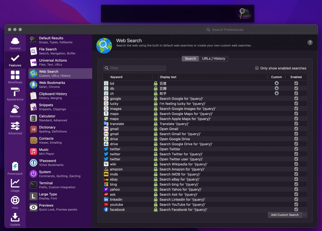 第一个必然要写一款重磅的,Alfred被称之为“Mac效率神器”。熟悉Mac朋友应该都知道,是Spotlight的无敌增强版,除了本地文件的搜索和应用启动,还支持快捷网络搜索(通过 “zh+搜索内容” 实现知乎搜索等)和Workflows(有道翻译、天气查询等),可以真正提高Mac的操作效率。